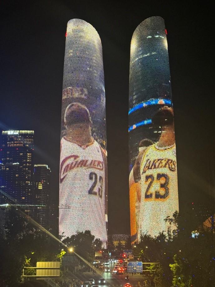 此外,成都的金融城双子塔也为詹姆斯亮屏,詹姆斯也前往这里打卡留念。